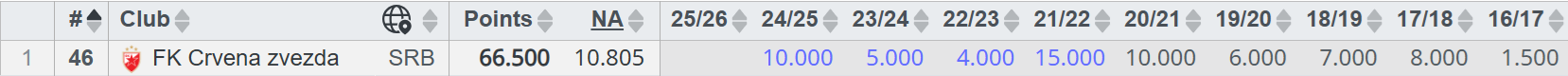 Ono što je sigurno - učinak u sadašnjoj takmičarskoj godini neće biti najgori u aktuelnoj deceniji jer je već premašen koeficijent iz 2016/17. kada je Zvezda ostala na 1,500 poena posle bolnih udaraca od Ludogoreca i Sasuola.