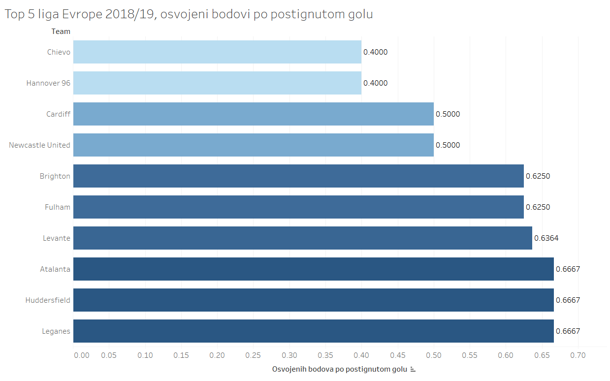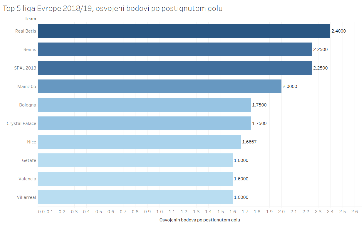 No, hajde da onda pogledamo koliko bodova je vredeo svaki gol svakog tima u pet najjačih liga Evrope. Računica je vrlo jednostavna – broj bodova se podeli sa brojem postignutih golova i dobije se ‚‚vrednost” svakog pogotka, odnosno broj osvojenih bodova po postignutom golu. Dakle, ako je neki tim osvojio pet bodova postigavši pet golova, oni osvajaju tačno 1.00 bodova po postignutom golu.