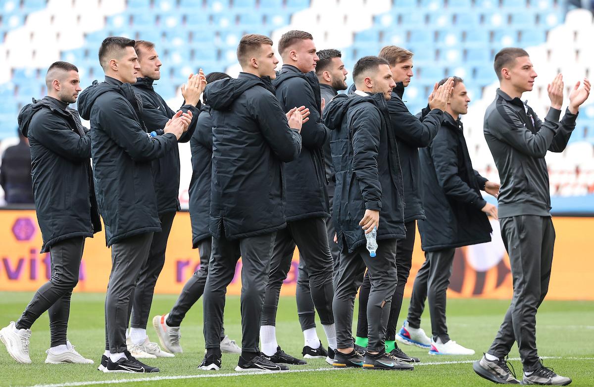 Crno-beli su u toku zagrevanja otišli do južne tribine i pod njom se zagrlili, a Grobari su ih pozdravili.